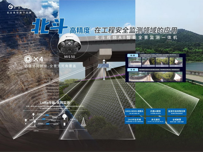 展会期间,吉欧电子展位聚焦工程监测痛点,集中展示了基于鸿蒙系统的国产化北斗高精度监测接收机等核心产品。其中,基于多源技术融合的监测新品——“北斗视频AI智能全景监测一体机MIS50”重磅亮相。